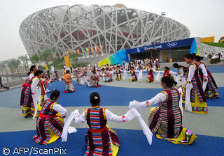 Tibetan performers rehearse for the Beijing 2008 Olympic Games opening ceremony in Beijing, China