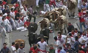 Kas rytą penki buliai ir tiek pat jautukų paleidžiami siauromis senamiesčio gatvelėmis. Jie iki bulvių kovos arenos bėga 825 metrus, kur kas vakarą nukaunami matadorų.