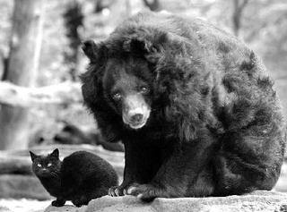 Draugės mėgsta kartu šildytis saulutėje, meška noriai dalijasi su kate žalia mėsa, negyvomis pelėmis, vaisiais ir duona.