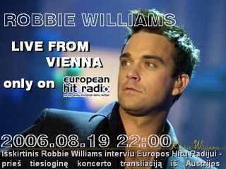 Nepakartojas Robbie Williams (32) koncertas gyvai tik per European Hit Radio! Rugpjūčio 19 dieną 22 val. įsijunk European Hit Radio ir mėgaukis įspudingu garso pojūčiu.