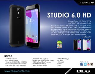 Blu Studio 6.0 HD оснащен четырехъядерным процессором с частотой 1,3 ГГц в составе платформы MediaTek MT6582, 1 Гб оперативной и 4 Гб встроенной памяти, парой камер с разрешениями 8 и 2 мегапикселя, а также аккумулятором емкостью 3000 mAh. Фаблет Studio 6.0 HD «из коробки» работает под управлением ОС Android 4.2.2, однако производитель уже пообещал обновление до версии 4.4 KitKat до конца мая.