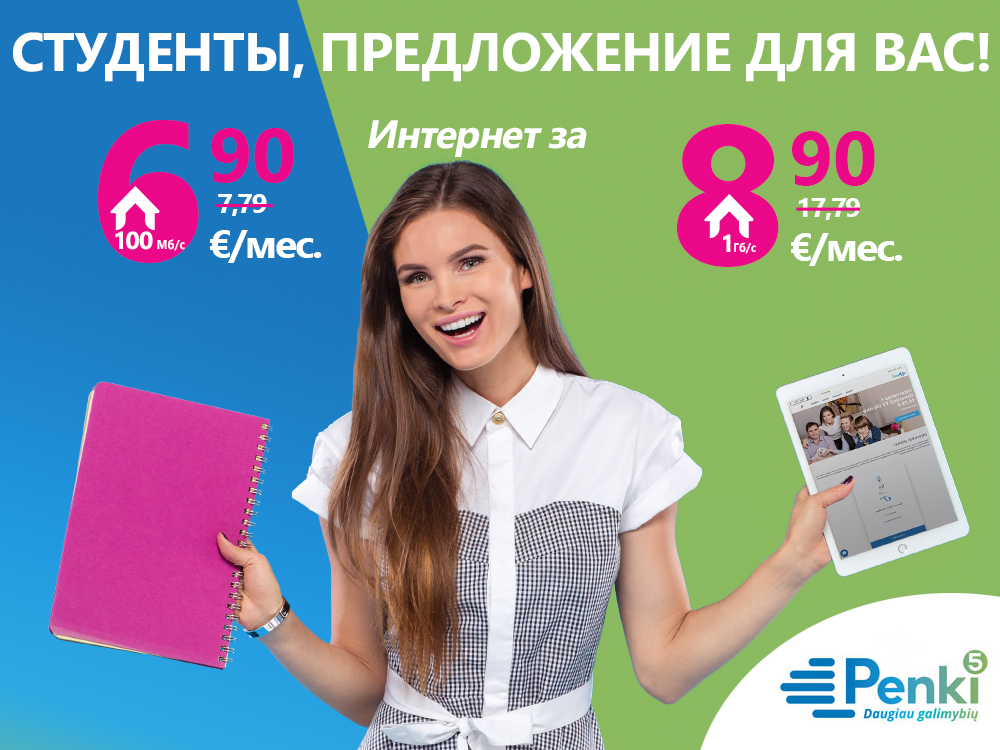 Элита, от имени сети Penki, приглашает вильнюсских студентов заранее подготовиться к учебному году. С 16 июля студентам, подписавшим договор на 9 месяцев, Интернет предлагается по специальным ценам: план GO (100 Мб/с) - 6,90 €/мес., RUN (1 Гб/с | 500 Мб/с) - 7,90 €/мес., FLY (1 Гб/с) – 8,90 €/мес.
