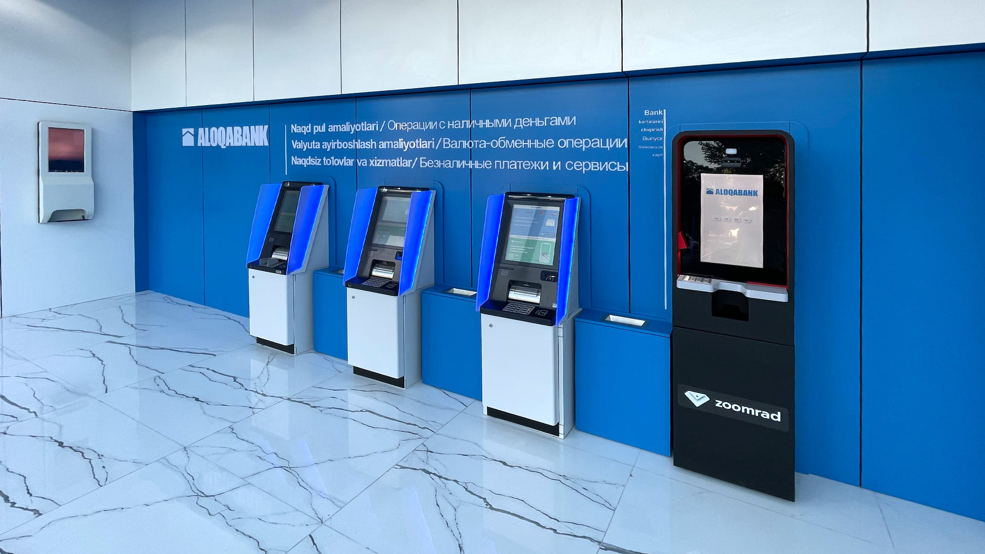 Также на территории IT-парка своих первых клиентов принял инновационный банковский филиал AloqaBank. В рамках данного проекта BS/2 совместно с командой банка реализовала проект оснащения зоны самообслуживания на базе современных банкоматов DN Series от Diebold Nixdorf. При этом клиентам доступны функции обмена валюты на банкоматах. Также в тестовом режиме запущено решение по погашению кредитов и бескарточное снятие наличных на банкоматах с использованием решения Payments.iQ.