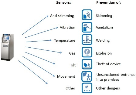 Lately, attempts to break into or even to blow up ATMs have been quite often reported. ATMeye.iQ can be useful in situation like these as well. This solution is compatible with any kind of sensors: antiskimming, vibration, temperature, gas, smoke, tilt, movement, etc. Captured information can be transmitted to the bank, enabling it to analyze the situation in real-time and to take necessary actions. Thus, ATMeye.iQ helps respond, as fast as possible, to criminal attempts to blow an ATM up or damage it in any other way.