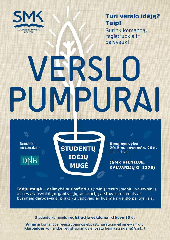 Š. m. kovo 26 d. Socialinių mokslų kolegija (SMK) kviečia visus SMK studentus burtis į komandas, galvoti, svajoti ir drąsiai bei išradingai pristatyti savo verslo idėjas, originalius sumanymus bei preliminarius verslo planus Studentų idėjų mugėje „Verslo pumpurai“.
