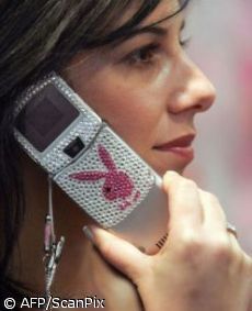 Mergina kalba mobiliuoju telefonu su Playboy logotipu