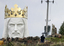 A man stands near the crowned head of a statue of Jesus being built in Swiebodzin