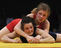 Estera Dobre (bottom, in blue) from Romania fights with Yuliya Blahinya from Ukraine in the final of the European Wrestling Championship 51 kg freestyle woman event in western Germany