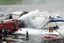 Firefighters try to extinguish fire on a plane belonging to Taiwan's China Airlines Ltd. that exploded and caught fire soon after landing in Naha on Japan's southern island of Okinawa