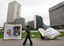Abseilers descend a building on a busy main road for a shopping mall promotion in Hong Kong