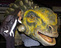 Whoopi Goldberg playfully whispers to a replica of an Ankylosaurus dinosaur