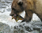 A grizzly bear holds onto a freshly caught pink salmon