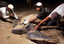 Local volunteers take measurements and check for injuries on a giant leatherback turtle as she lays her eggs in Plaplaya, Honduras