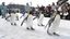Visitors admire king penguins walking on a road covered with snow at Asahiyama Zoo in Asahikawa, in northern Japan