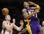 Los Angeles Lakers guard Kobe Bryant reacts in front of New York Knicks forward David Lee (L) as he is fouled by Knicks forward Tim Thomas (hidden) in the fourth quarter of their NBA basketball game