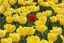 A red tulip stands alone with yellow tulips