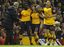 Arsenal's Andrey Arshavin, centre right, celebrates with teammates and manager Arsene Wenger, left, after scoring against Liverpool