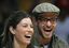 Actress Jessica Biel and entertainer Justin Timberlake share a laugh during the NBA basketball game
