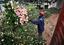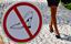 A woman walks past a sign forbidding those shoes, along a coble-stoned pathway leading to the offices of German pharmaceutical company Boehringer Ingelheim