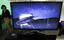 An employee of Samsung Electronics walks past one of its 3D LED televisions displayed for visitors at the company s headquarters in Seoul.