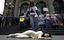 An animal rights activist pretends to abuse another activist dressed in a lion costume during a protest against the use of live animals in circuses in front of Mexico City’s local legislature April 22, 2010
