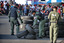 -shirted anti-government protesters (background) watch while Thai explosive ordinance disposal experts search for a suspected hand grenade found amidst used tyres inside the "Red-shirt" anti-government protesters fortified camp