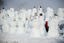 A child walks amidst the numerous snowmen built in a park in central Moscow