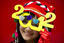A model wearing a pair of 2012-shaped glasses smiles during a promotional event outside a shopping mall in Hong Kong