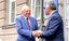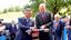 Kazachstano Respublikos Nepaprastasis ir įgaliotasis ambasadorius Lietuvoje Baurzhanas Mukhamedzhanovas (dešinėje) sveikina Kazachstano garbės konsulą Lietuvoje Joną Jagminą (kairėje)